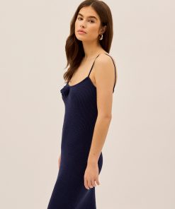 A timeless silhouette with a playful twist, the Betty Dress is all about understated sophistication with a feminine edge. Crafted from a lightweight crepe ribbed knit, this midi dress is fitted throughout for a flattering, sculpted look. Spaghetti straps keep things sleek, while fixed knitted rose brooches along the neckline add a romantic touch. The frilled hem brings soft movement, making it a standout choice for both day and night.