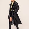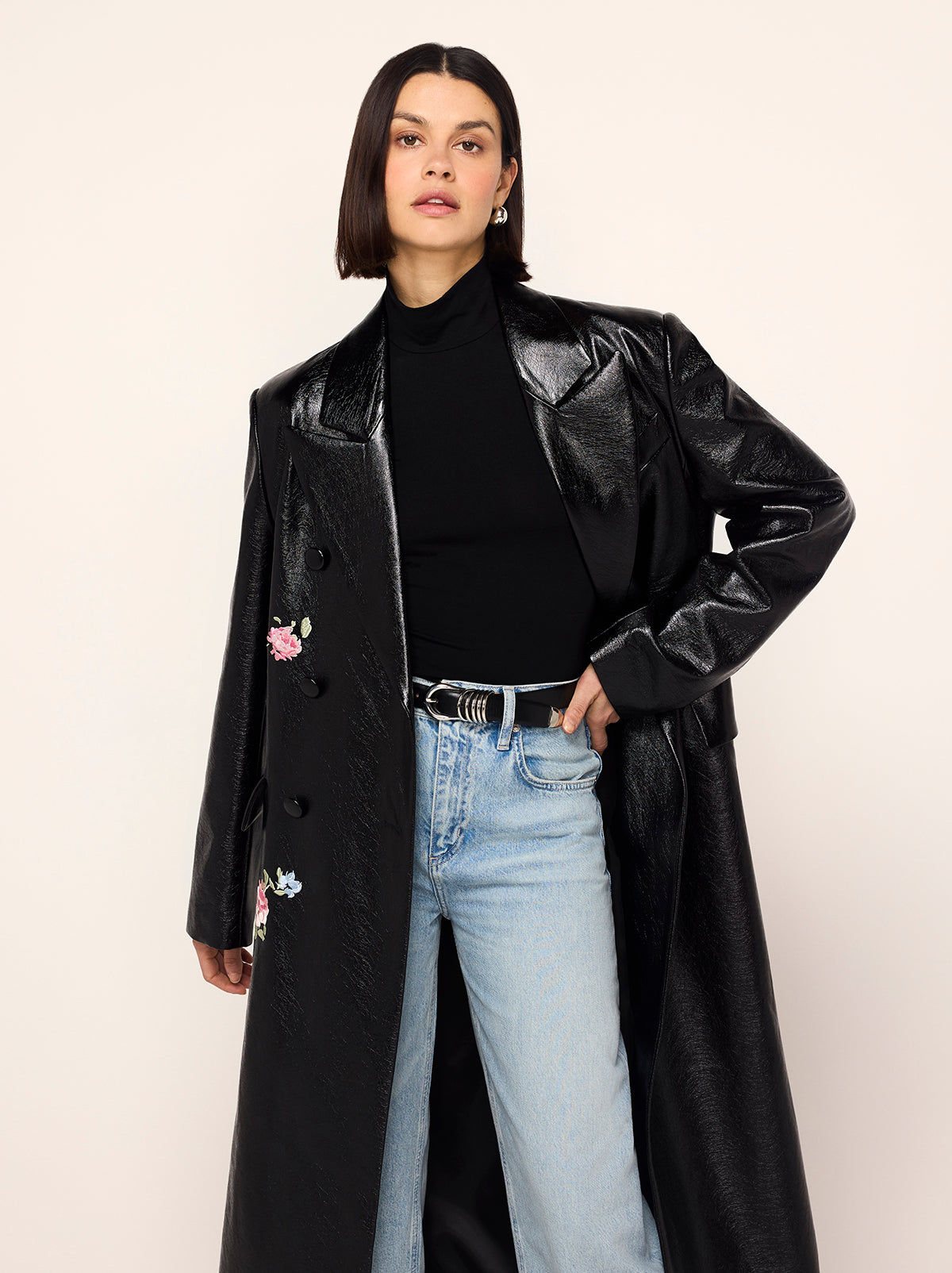 Skip the cloakroom. Brogan is an oversized, double-breasted coat in high-shine vinyl with an ’80s-inspired statement shoulder and peaked lapel. Her bold silhouette is tempered by a tonal placement floral embroidery. Wear with co-ordinating Carolyn Black Embroidered Vinyl Mini Dress for a full glossy-chic look.