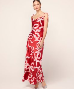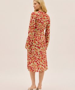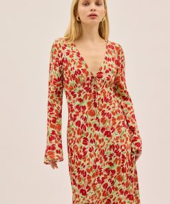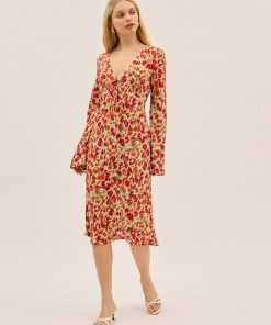 A fresh new silhouette for every RSVP. The Carrie Tulip Print Dress features a flattering deep V-neckline with a soft bow tie detail, flared long sleeves, and a calf-length skirt. Designed in our vibrant red tulip print, it brings soft drama to your occasion wear wardrobe.