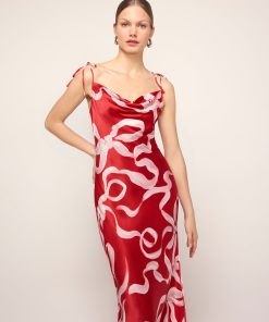 A fresh new silhouette for every RSVP. The Carrie Tulip Print Dress features a flattering deep V-neckline with a soft bow tie detail, flared long sleeves, and a calf-length skirt. Designed in our vibrant red tulip print, it brings soft drama to your occasion wear wardrobe.