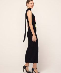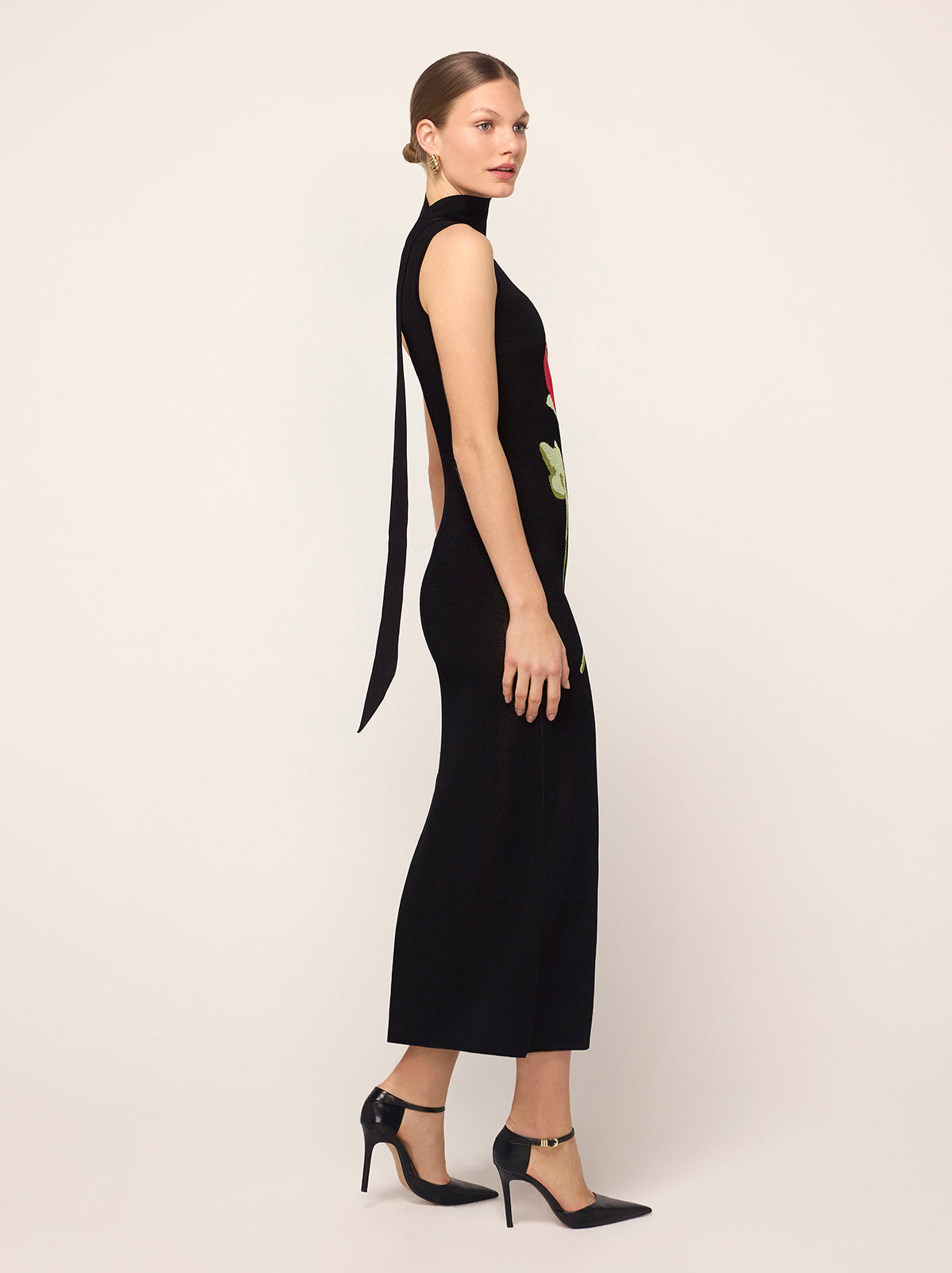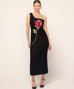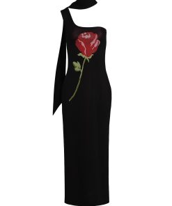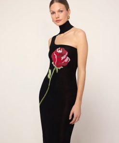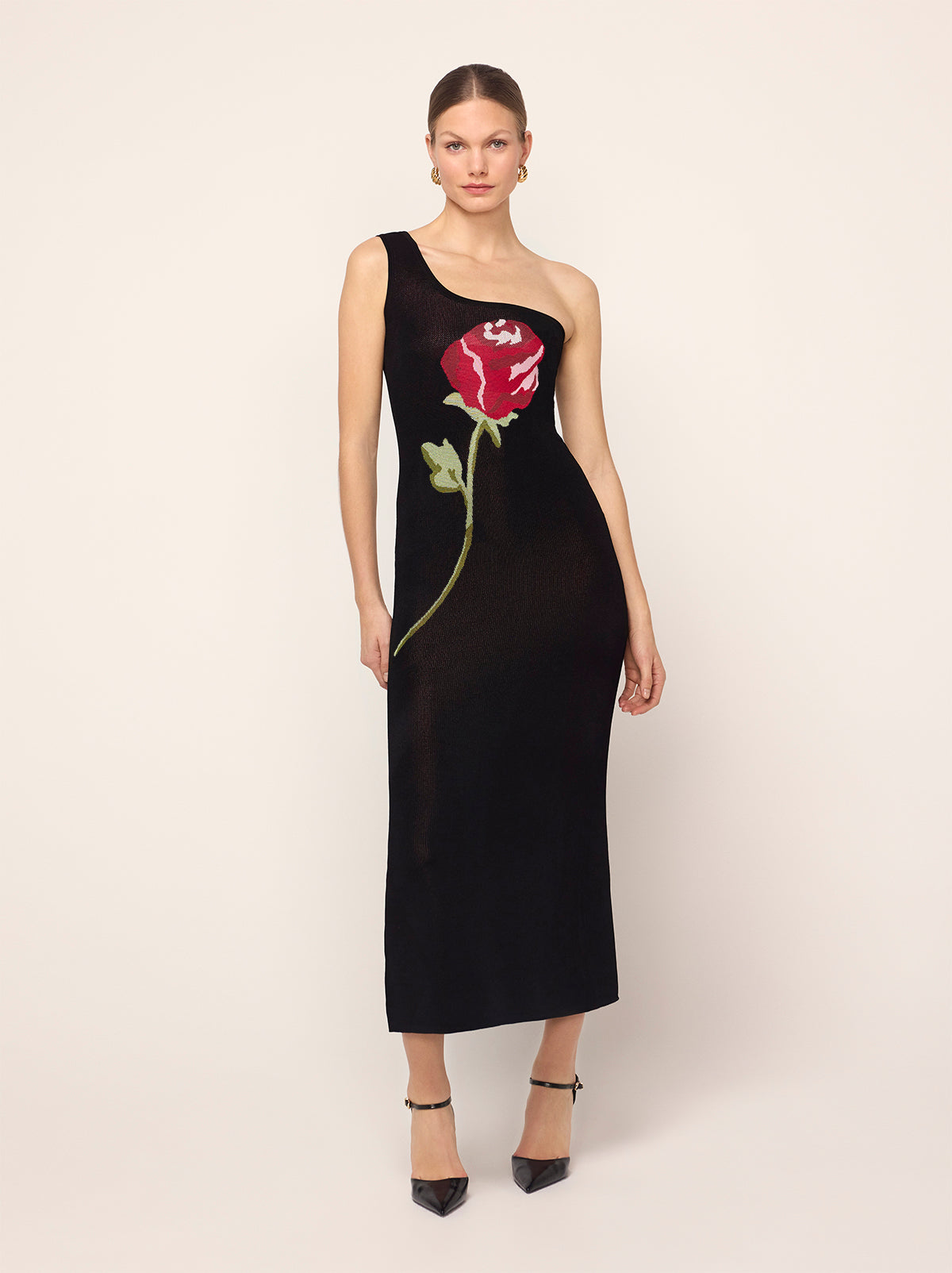 Hold for applause. Chloe is the ultimate blend of comfort and glamour, crafted in a sleek one-shoulder design from a form-fitting compact viscose knit. This dress hugs your curves in all the right places, while the bold jacquard rose artwork makes a dramatic statement. The detachable neck tie adds an extra touch of glamour, allowing you to customise your look depending on the occasion. Chloe’s midi length makes it versatile for both formal and more casual events, proving that chic and comfortable really can go hand in hand.