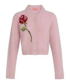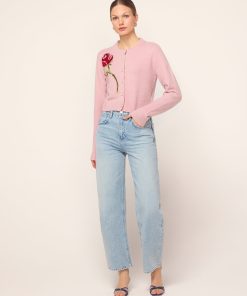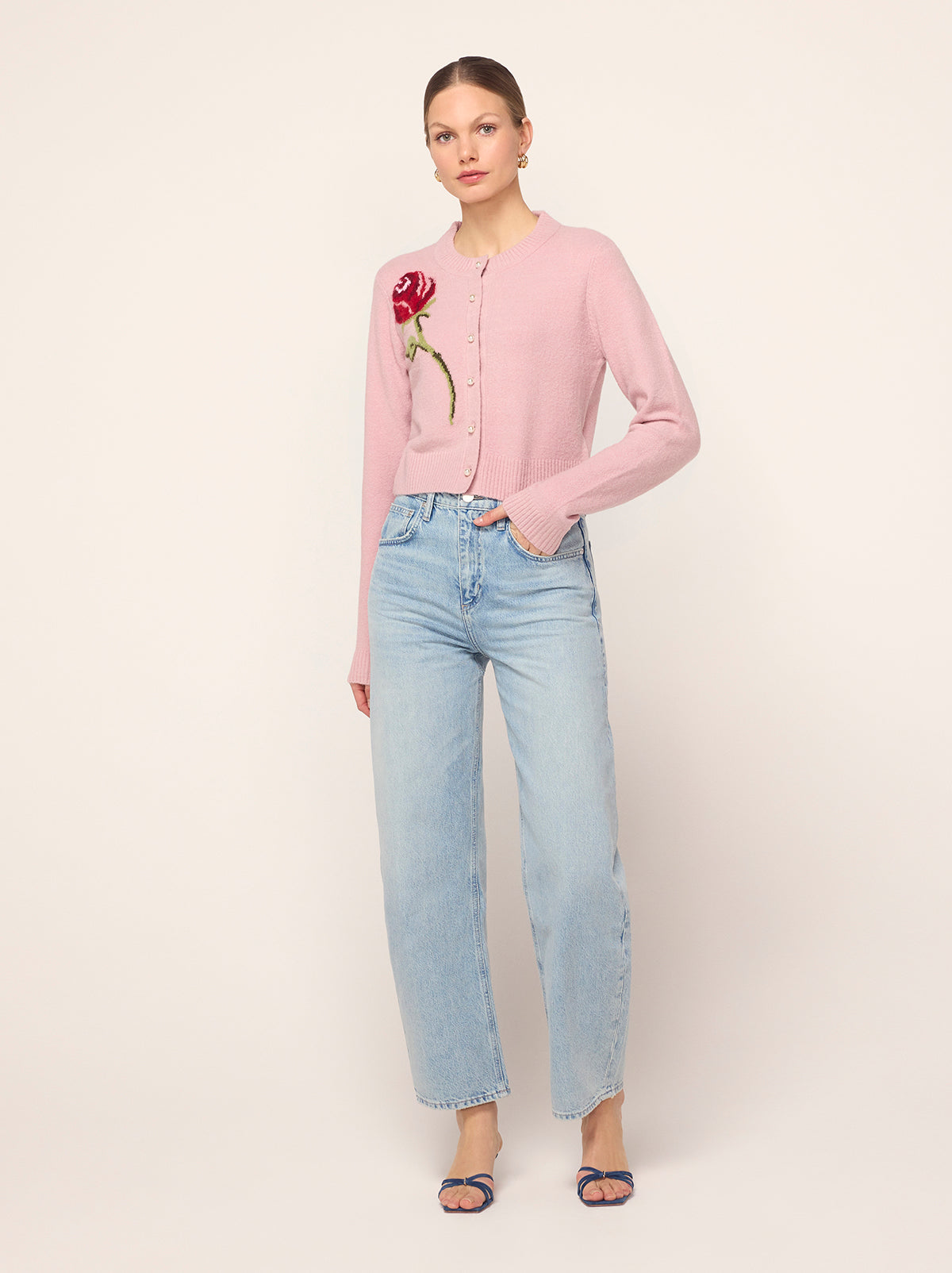 When your sweater is the outfit. Ginnie is a scoop neck, relaxed-fit cardigan in the perfect ballet pink shade. She’s all about the details, with her pearl buttons and rose jacquard design taking centre stage. Pairs well with ballet flats.