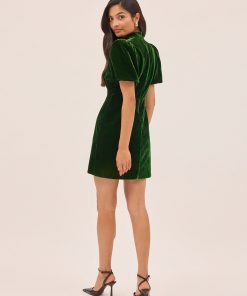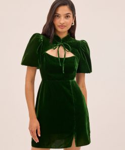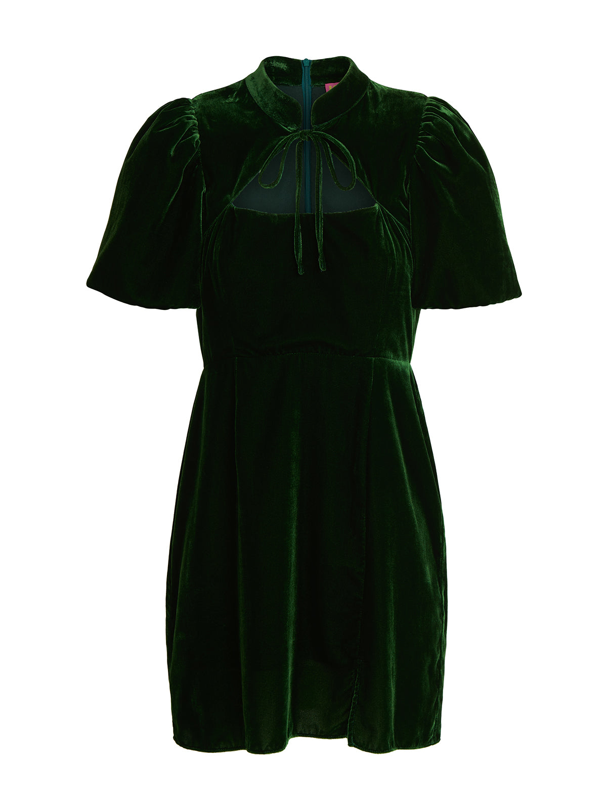 Velvet, we love you. Taking inspiration from our best-selling Valentina, we’ve kept her Cheongsam-inspired high neckline with tie detail and mini silhouette with split skirt, and added short puff sleeves for a playful take on the ever-so-flattering silhouette.
