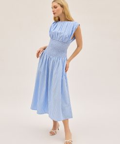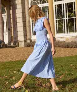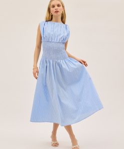 Crisp cotton, flattering shape, effortless charm. The Julia Dress is cut in a soft blue stripe with a wide boat neckline, gently gathered bodice and a shirred dropped waist that defines the silhouette. The full, A-line skirt falls to a midi length for an easy, throw-on-and-go feel without compromising on polish.