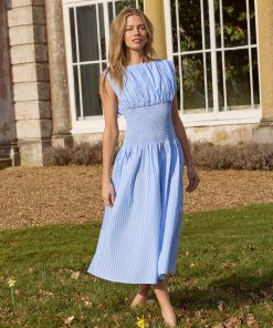 Crisp cotton, flattering shape, effortless charm. The Julia Dress is cut in a soft blue stripe with a wide boat neckline, gently gathered bodice and a shirred dropped waist that defines the silhouette. The full, A-line skirt falls to a midi length for an easy, throw-on-and-go feel without compromising on polish.