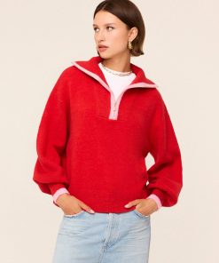 She’s back! Our #KITRIgirls favourite Lorna is a lightweight alpaca blend sweater featuring a pearl-tipped quarter-zip and drop shoulder, puffed sleeves. This season, she returns in a brand new colourway: warming red with pale pink tipping. We know you’ll love her.